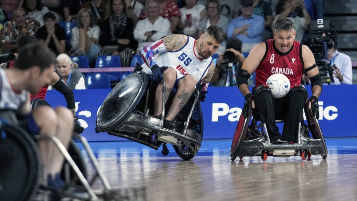 Mason Symons of the United States and Mike Whitehead of Canada vie for the ball during the 2024 Paralympics wheelchair rugby match between United States and Canada on August 29, 2024, at the Champ de Mars Arena in Paris. Wheelchair rugby, also known as “murderball,” can offer some of the most physical and fierce competition in any arena.