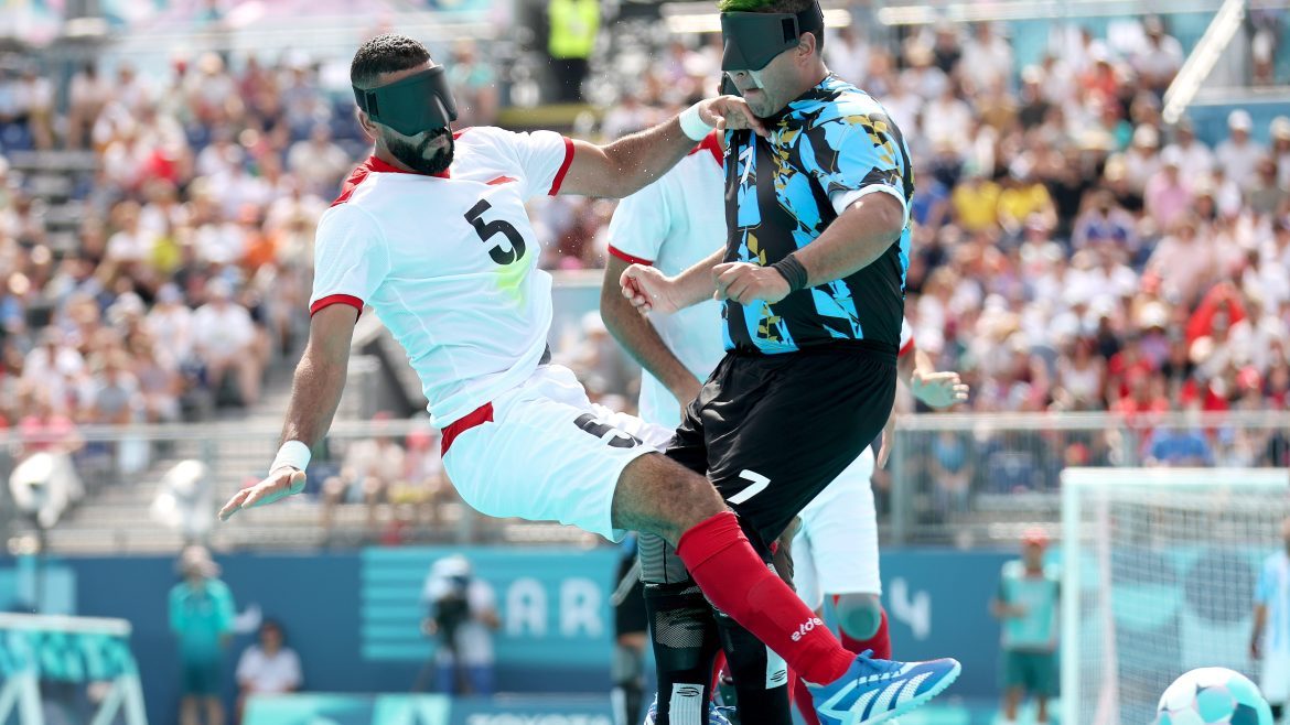Hicham Lamlas of Team Morocco collides with Maximiliano Espinillo of Team Argentina during a men’s preliminary group B blind football match on day four of the Paris 2024 Summer Paralympic Games at Eiffel Tower Stadium. Blind football is played between two teams of five, made up of four vision-impaired outfield players wearing blindfolds and a goalkeeper who is sighted or partially sighted. Players keep track of the ball by listening for a bell inside and pay attention to strategic cues shouted by their goalkeeper. Even with the amazing spatial awareness on display, not every collision can be avoided.
